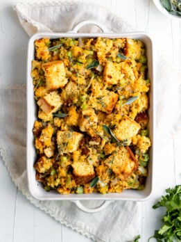 This chorizo cornbread stuffing(or dressing) is made with celery, onions, fresh herbs, and, of course, plenty of chorizo! Baked in a casserole or baking dish, this Thanksgiving side dish is extra easy to make at home and full of flavor.