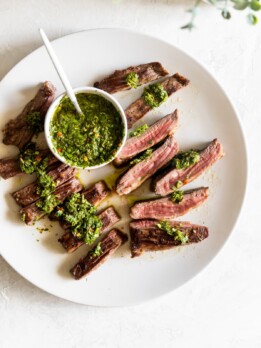 Who can resist un churrasco con chimichurri!? Que rico! This tender skirt steak is grilled to juicy perfection in just 10 minutes after marinating in a Cuban citrus-garlic mojo marinade. Serve with a delicious homemade chimichurri sauce for a picture perfect dinner!