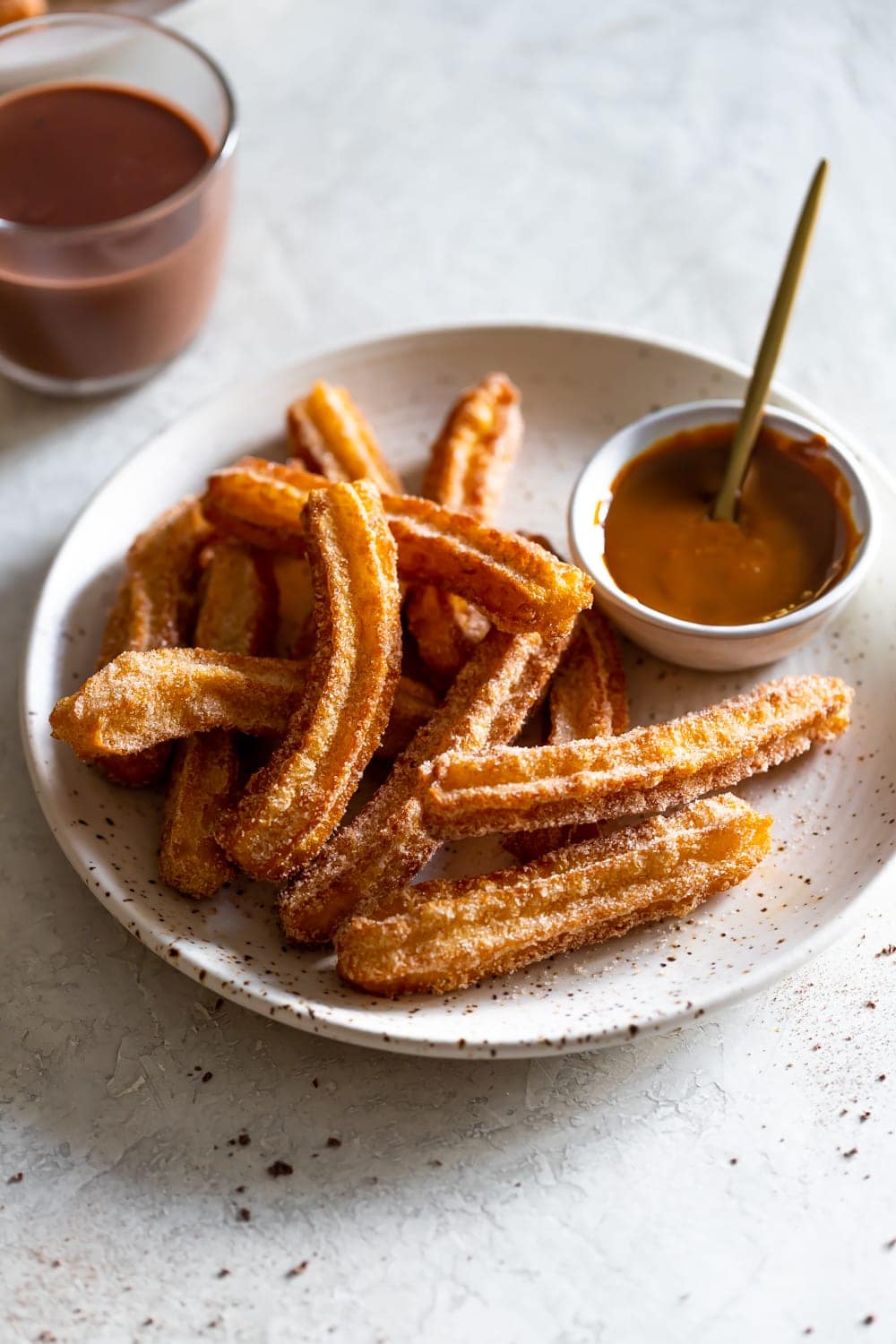 Serve churros with Spanish Chocolate Caliente, chocolate sauce (recipe below), or dulce de leche. Enjoy!