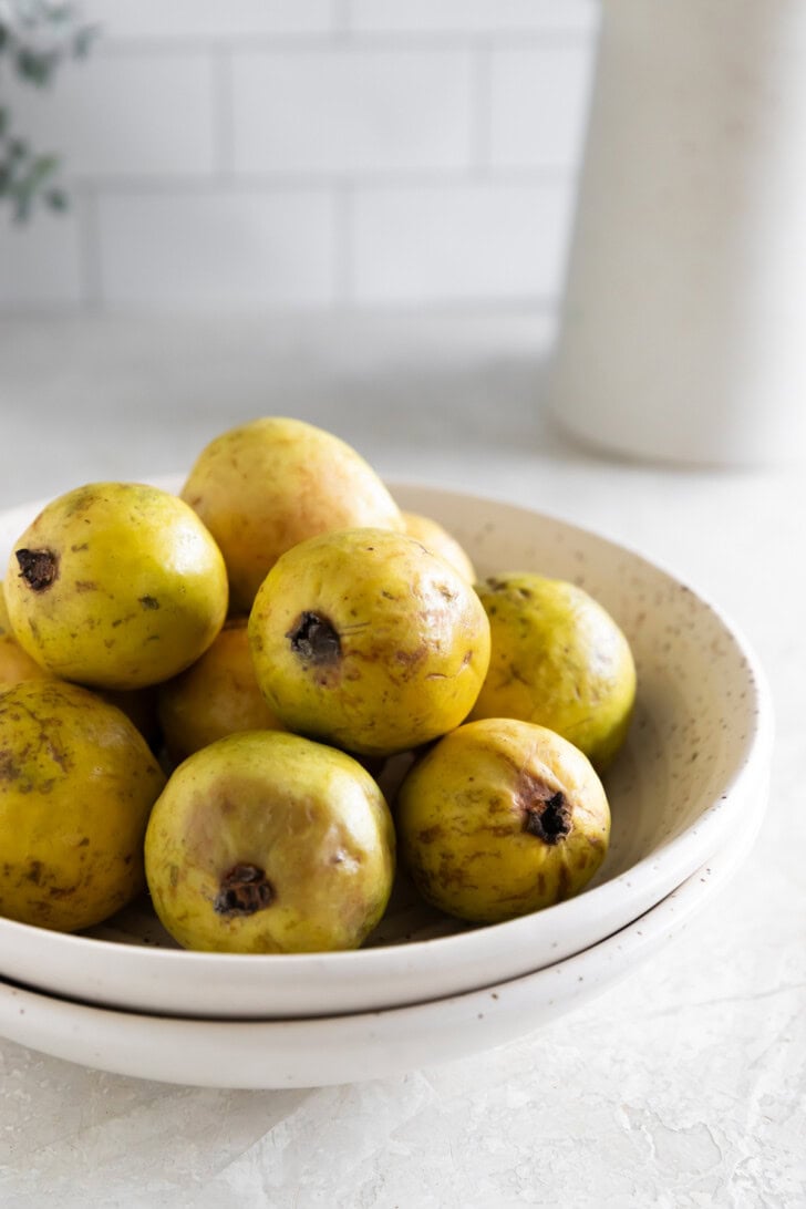 👉🏼 Make sure to look for ripe guavas. A ripe guava has green skin with pink flesh. When you squeeze it, it should be firm but have a bit of give. Kinda like a ripe pear. The smell is also fragrant, sweet, and tart.