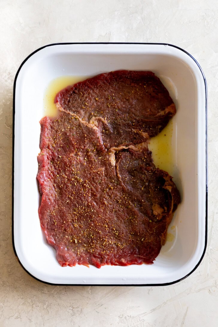 - In a shallow dish, add the steaks. Pour the mojo marinade and season with complete seasoning and garlic powder on both sides. Salt and pepper to taste.