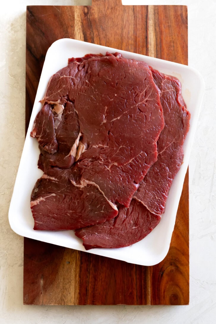 - If the steaks are already thin, you can skip this step. On a cutting board, place steaks between two pieces of plastic wrap. Using a meat mallet, pound the steaks until they're 1/4-inch thin.