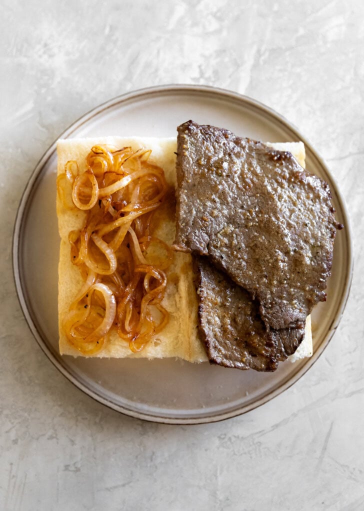 Unpopular opinion: Sometimes you’ll see this pan con bistec served with mayo, lettuce, and tomato. If you want to add them, you do you. But, for me, I’ll take a hard pass on hot lettuce and tomato. The way I grew up enjoying this classic Cuban steak sandwich was with sautéed onions and potato stix. And that’s all you need!
