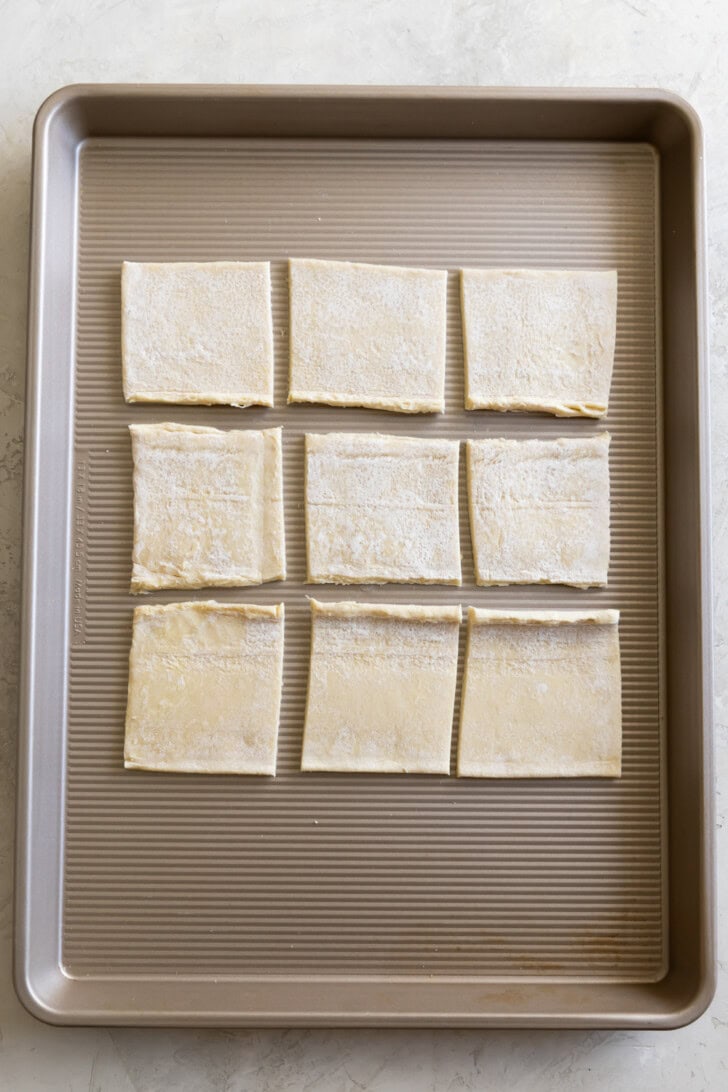 - Unfold one of the pastry sheets and place it on the cookie sheet. Slice the pastry sheet into 9 squares using a strip knife or a pizza cutter.