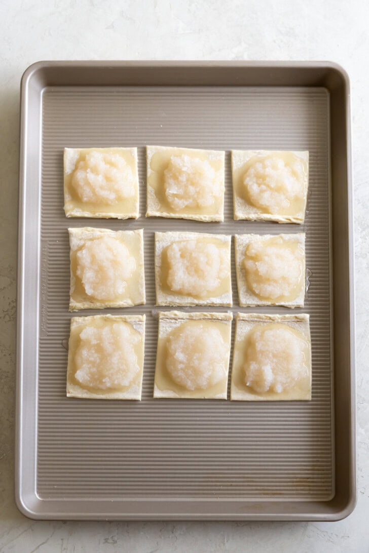 - Using a fork or slotted spoon, add 1-2 tablespoons of the grated coconut per square. Too much syrup will make the puff pastry soggy so be mindful of this.