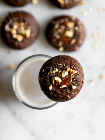 Soft, classic chocolate thumbprint cookies with salted caramel centers, drizzled with melted dark chocolate and chopped hazelnuts. Feels like I’ve been baking all month....