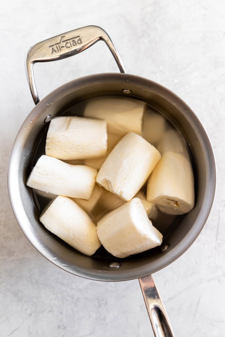 Ok, boiling the yuca is easy peasy. All you have to do is add the yuca to a large pot of salted water and bring it to a boil over high heat.