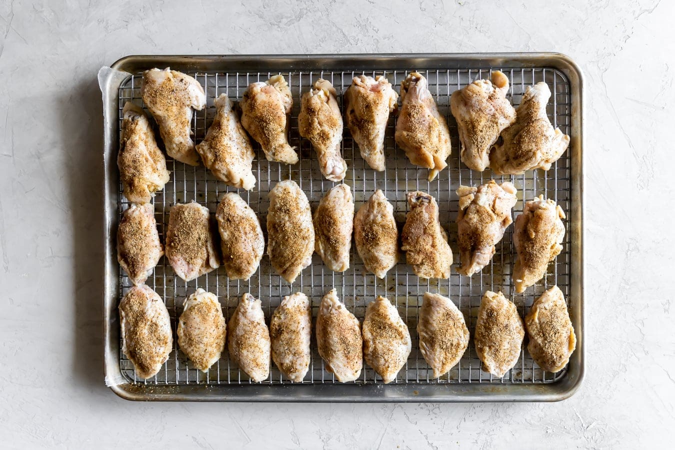 Once you’re ready to bake, set a wire rack on top of a lined baking sheet. This allows air to circulate around the wings and fat to drip off which will result in the wings cooking evenly and getting extra crispy.