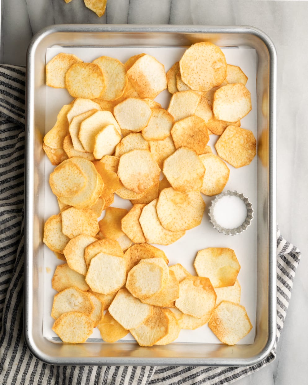 - Preheat oven to 450ºF. Lay the malanga slices on a parchment paper-lined baking sheet in an even layer. Bake for 5-8 minutes, flip, then bake for another 5 minutes until golden brown. Every oven is different so keep an eye on it so they don’t burn. Season with salt once they’re out of the oven.