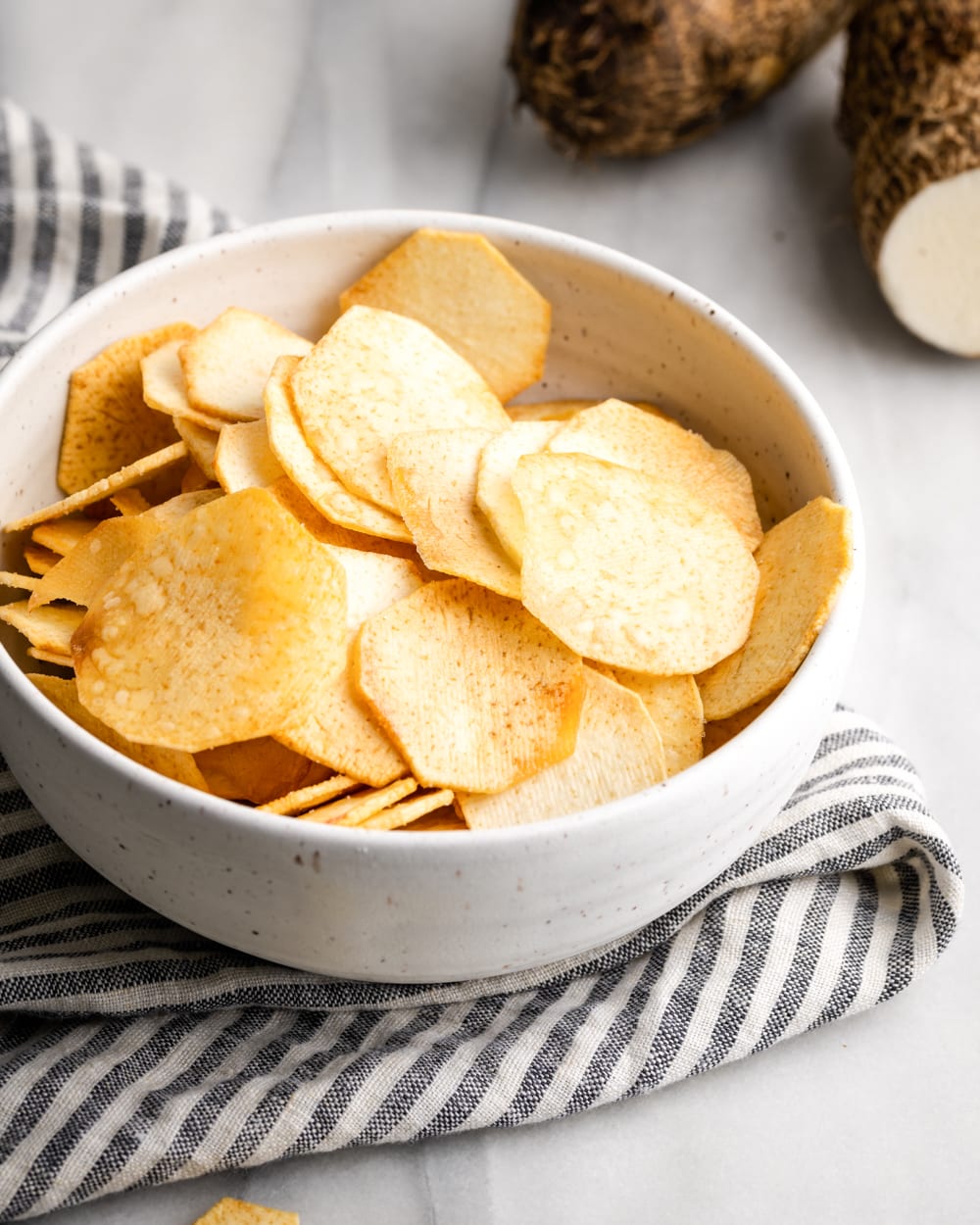 - Even, thin slices are a must. Make sure you find a taro root that is the same size all around so the chip slices are evenly in size. Also, make sure they are sliced very thin so they cook evenly.