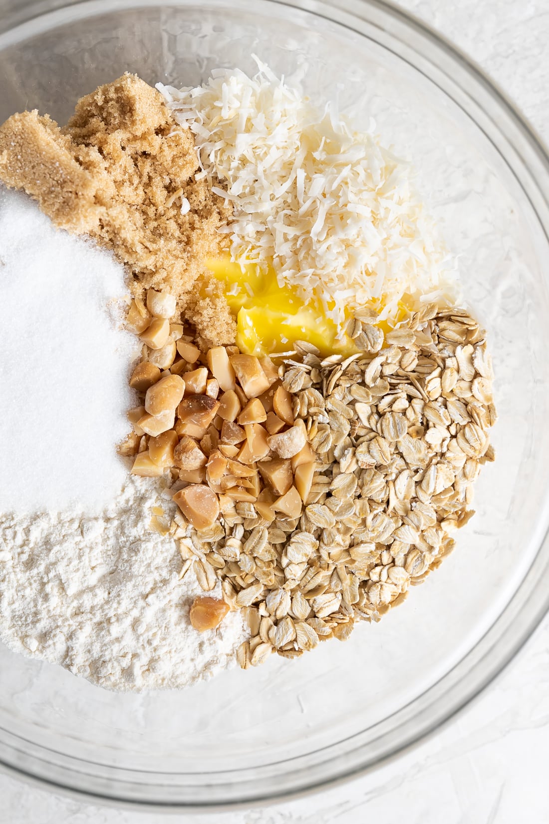 - In a large bowl or stand mixer, mix butter, flour, brown sugar, and granulated sugar until well combined. Fold in the oats, macadamia nuts, and shredded coconut flakes. The dough will be thick, buttery, and crumbly. Don’t be alarmed if it looks dry, that’s totally ok!
