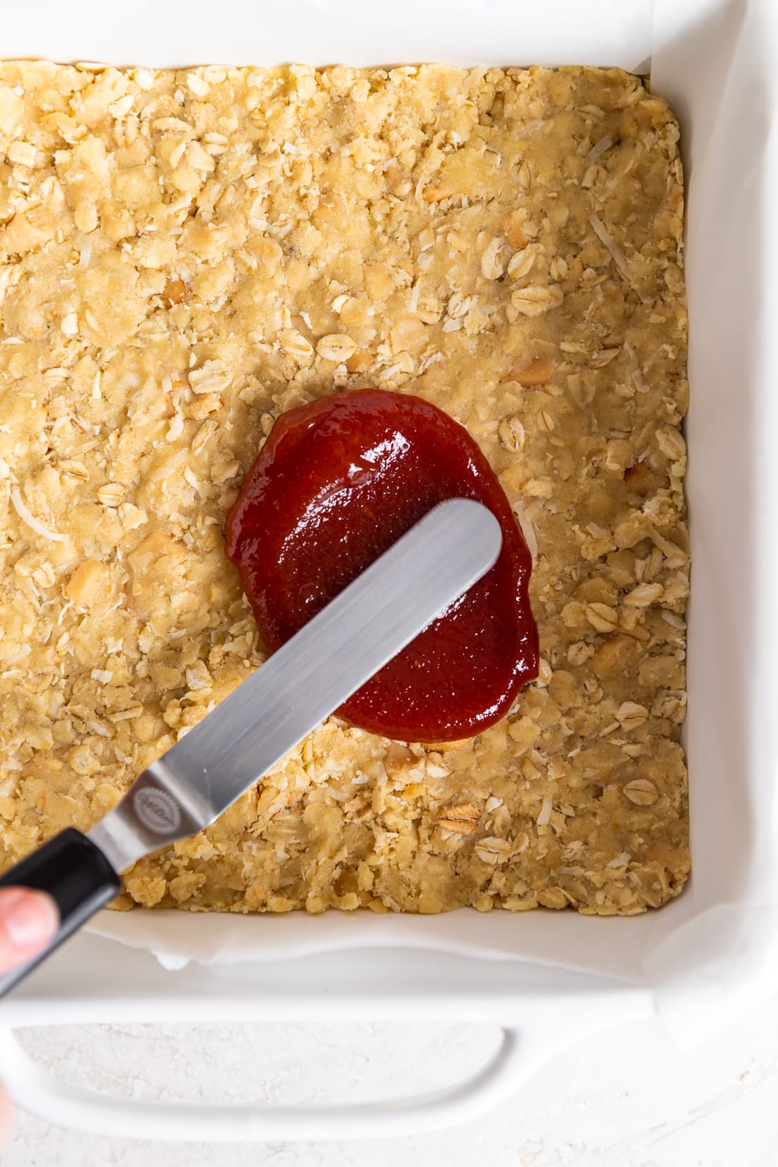 - Line the baking dish. Line and lightly grease the baking dish with parchment paper. Jam can get sticky so lightly greasing the parchment will help remove them easier.
