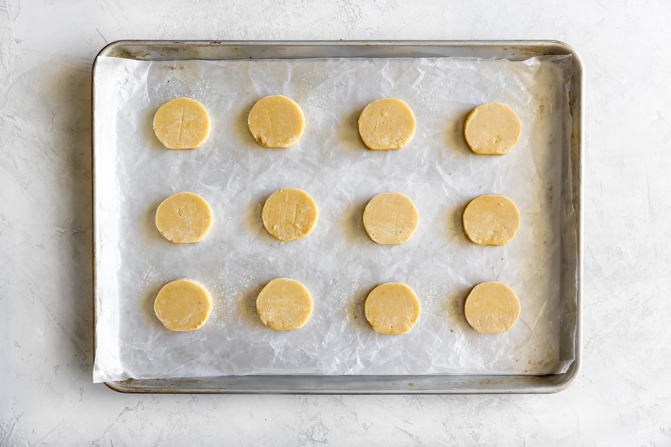 - Remove logs from the fridge. Slice log into 12 evenly thick cookies and place on the baking sheet. Brush the cookies with whisked egg white (egg wasand sprinkle with sugar.