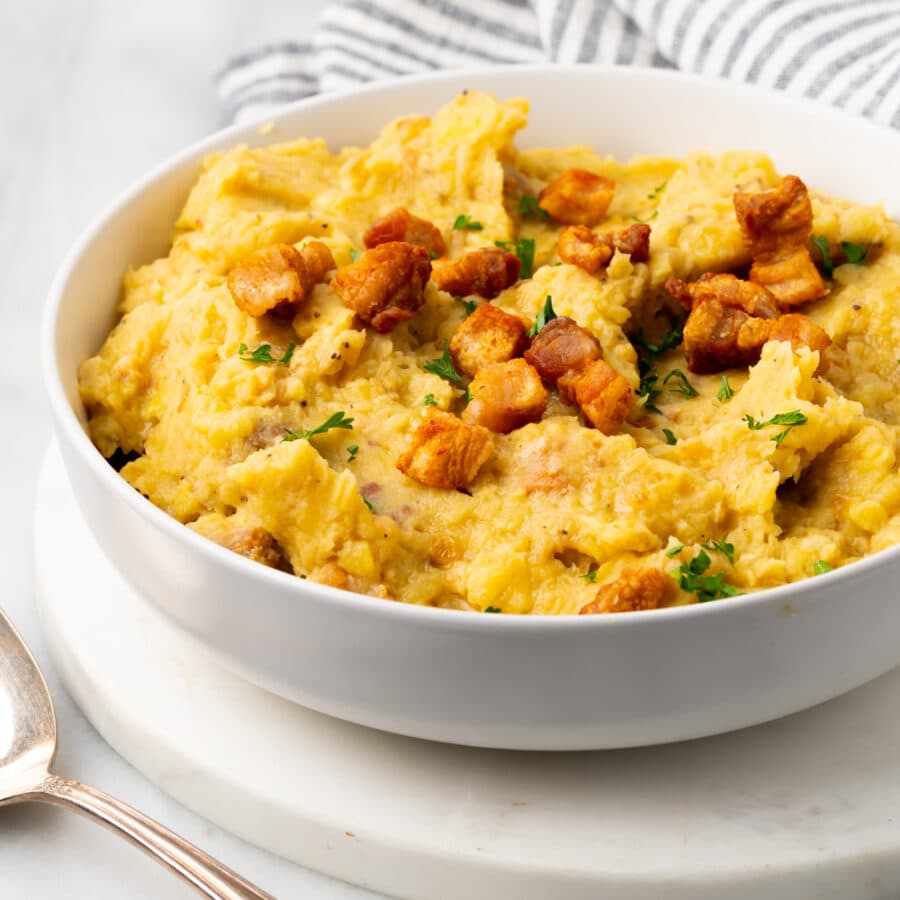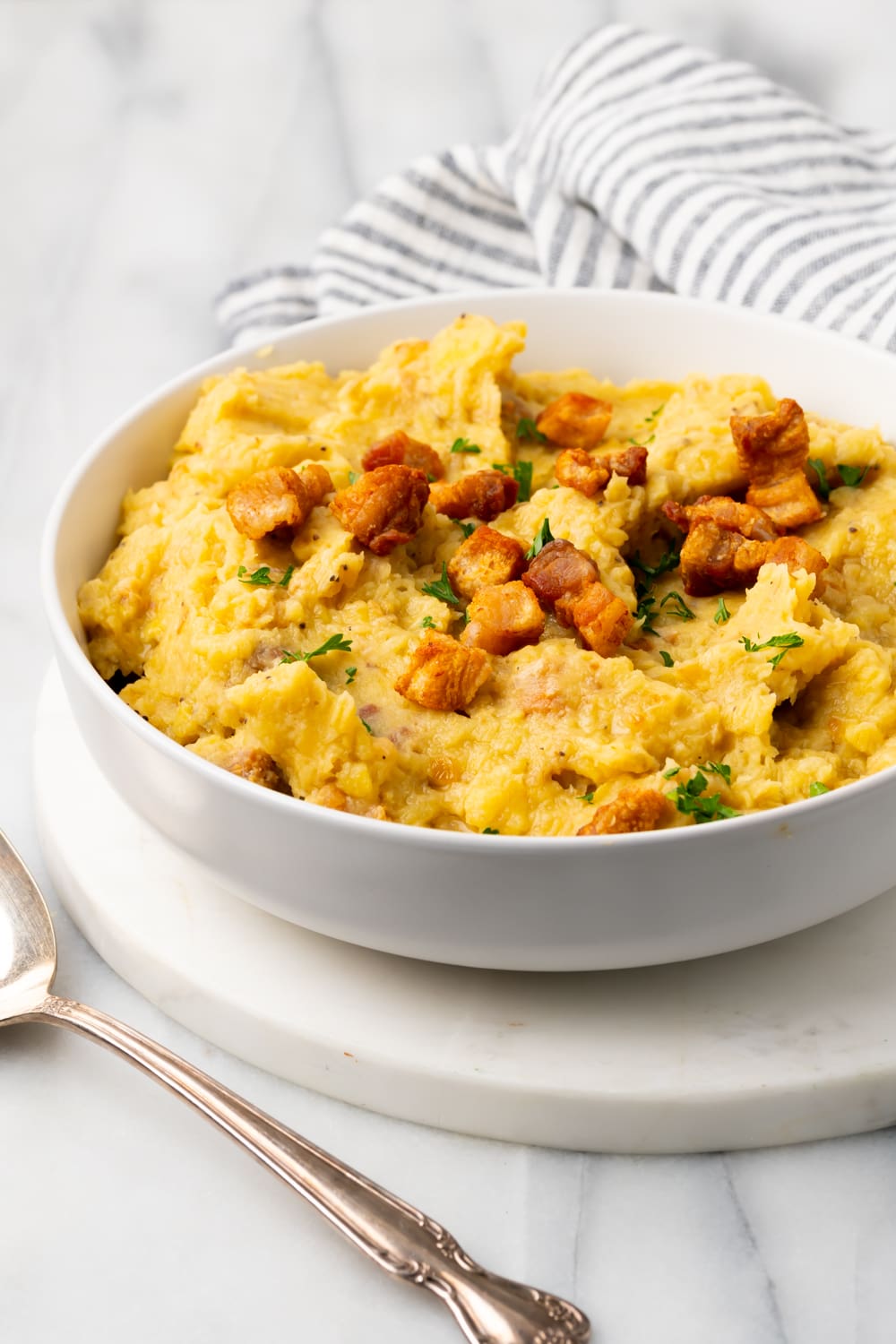 - Fold in the pork pieces but leave some to sprinkle on top. Season with salt and pepper to taste.