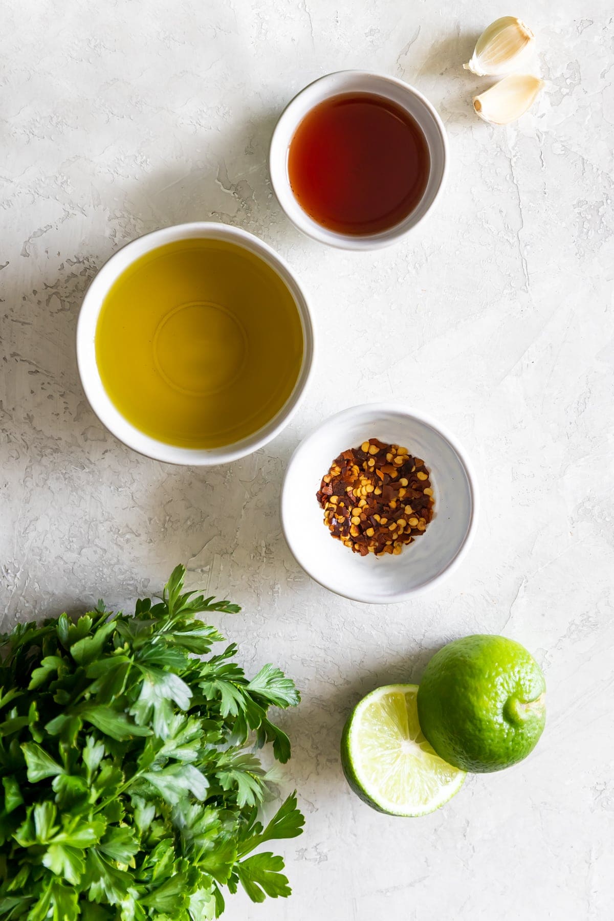 In a food processor, add flat-leaf parsley, garlic, red wine vinegar, lime juice, dried oregano, salt, pepper, red pepper flakes, and olive oil.