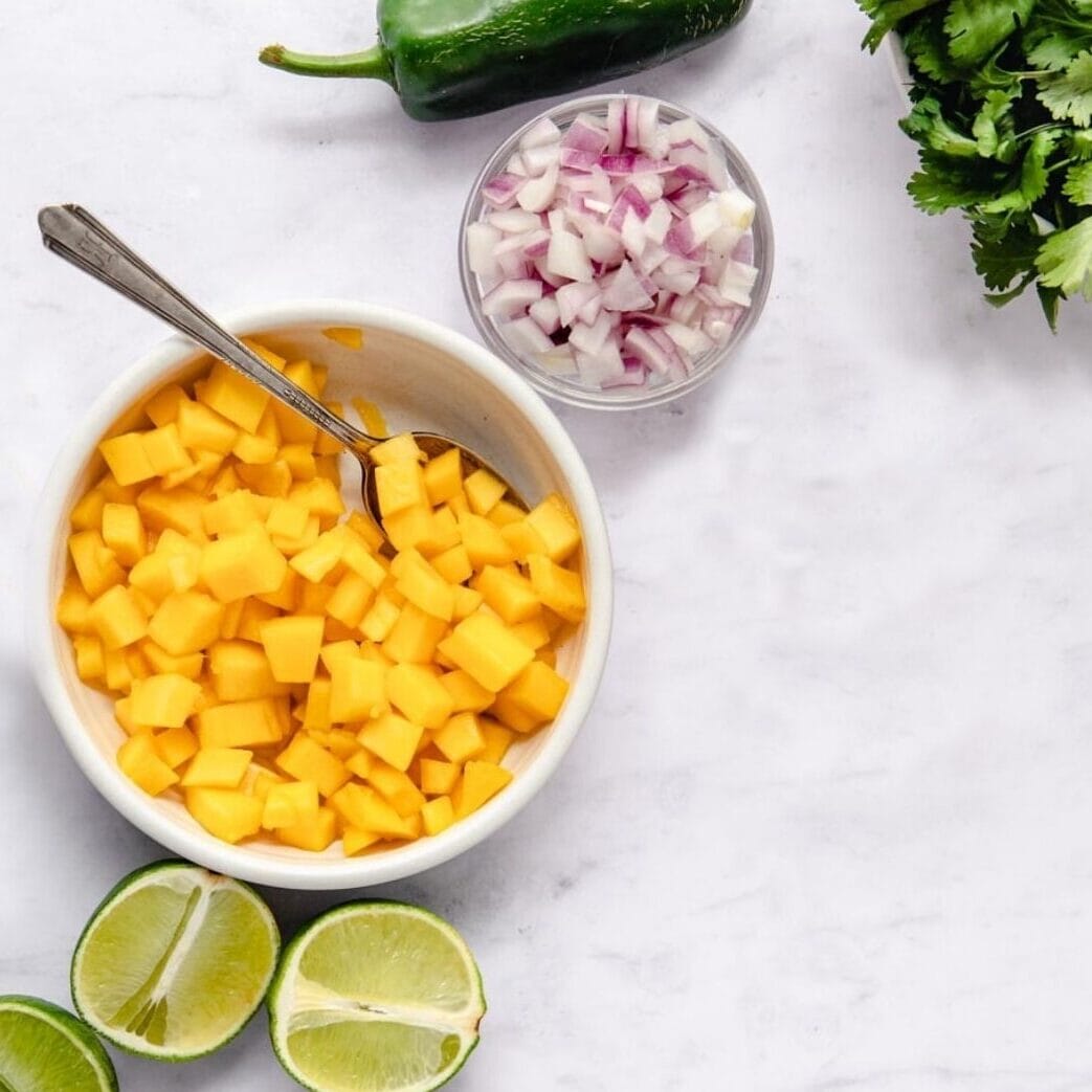 - In a bowl, add the diced mango, chopped red onion, and minced jalapeño. Mix together until well combined.