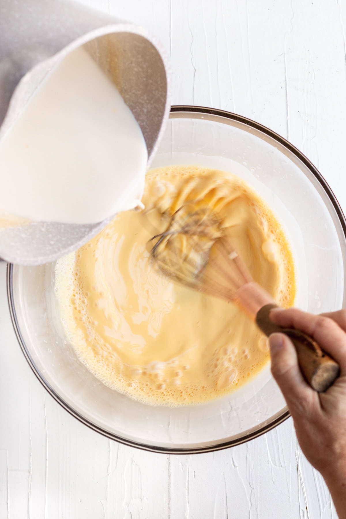- Temper the eggs. Slowly pour the heated evaporated milk over the eggs while whisking to combine. Be careful not to pour in too much milk at a time or you will get scrambled eggs and will have to start over. This step will help reduce your risk of salmonella. Don’t skip this step!