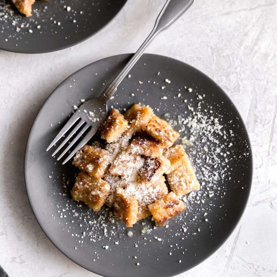 - Pan-fry the gnocchi. In a large skillet, melt 1 tablespoon of butter. Fry the gnocchi, in batches, at medium-heat heat, until a crust forms on both sides. Repeat with all the gnocchi. Transfer the fried gnocchi to a bowl and toss with the brown butter garlic sauce. Serve and sprinkle with more parm if desired. Enjoy!