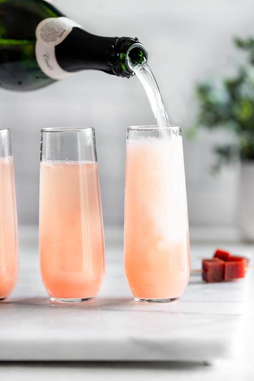 - Use chilled ingredients. No one wants a warm mimosa so make sure to keep your champagne and guava nectar chilled before making the mimosas. I don’t recommend freezing the champagne because (a) the bottle can explode in the freezer (I, unfortunately, speak from experience) and (b) overchilling will kill the bubbles. The ideal temperature to serve Champagne is 8-10°C (47-50°F).