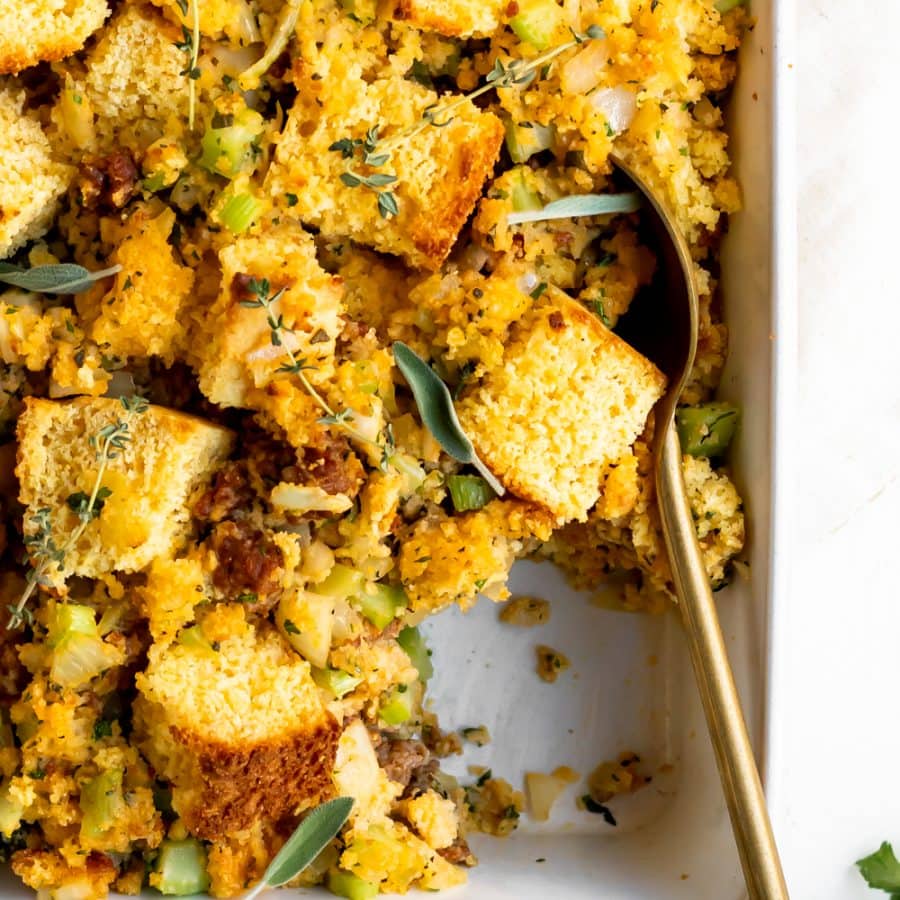 Listen, the cornbread is doing a lot of the heavy lifting here. Using cornbread instead of regular bread for this stuffing recipe was a real game changer. Cornbread is moist on the inside with golden, toasty edges that hold up beautifully once baked. YUM!