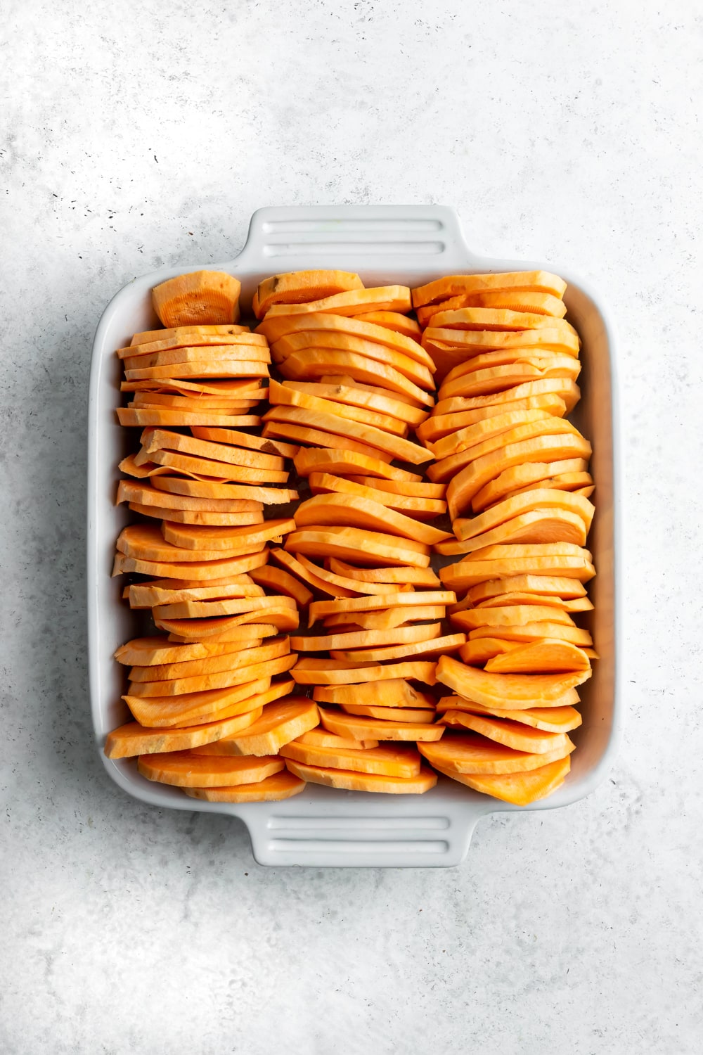 - Arrange the potato slices vertically at an angle in the dish, filling it without crowding it. Make sure there's space in between each slice so it cooks evenly. Set aside.