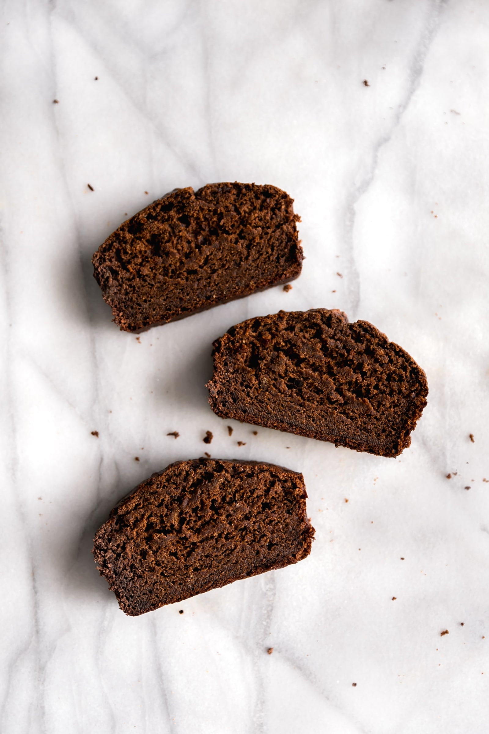 It’s so rich and decadent, you guys. It doesn’t have chocolate chips because well, it doesn’t need it. You can definitely add them if you’d like, but I just wanted intense chocolatey goodness. The key to super moist banana bread is to use 4 frozen, super ripe (black) bananas and use brown sugar.