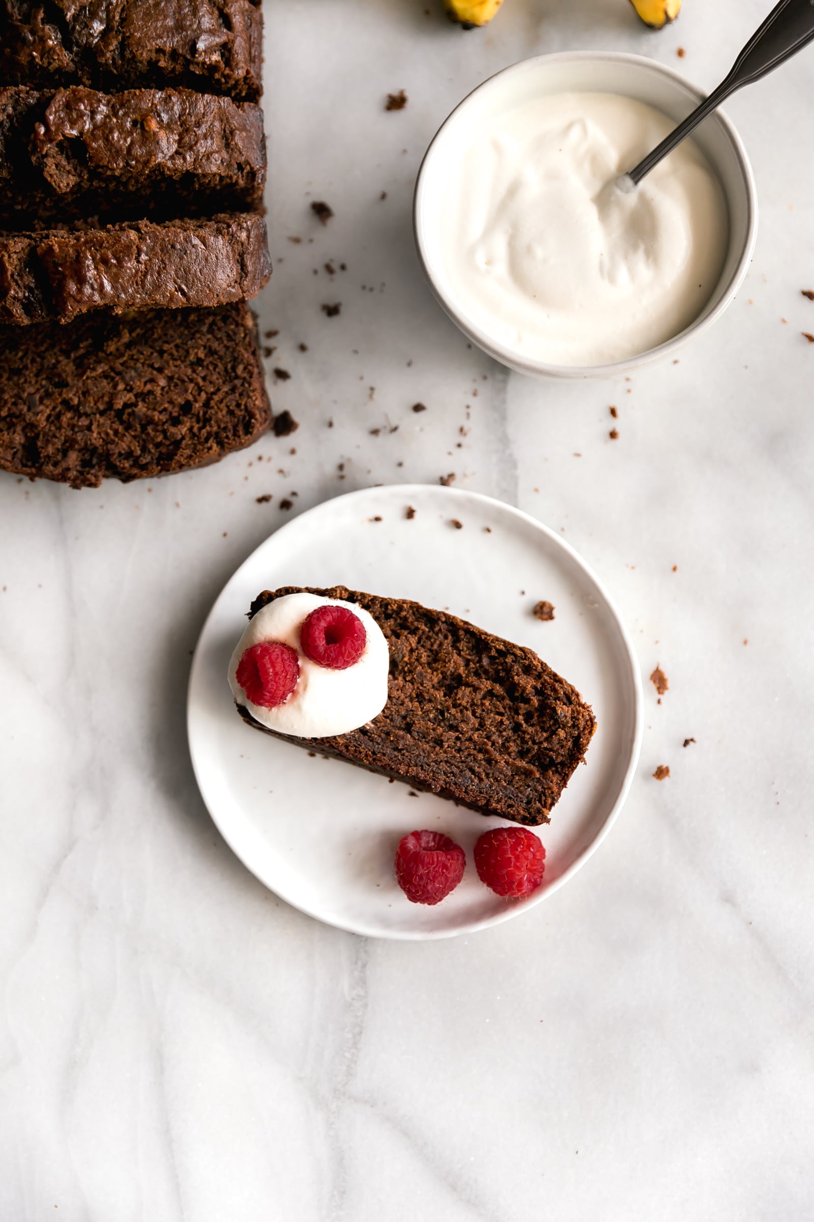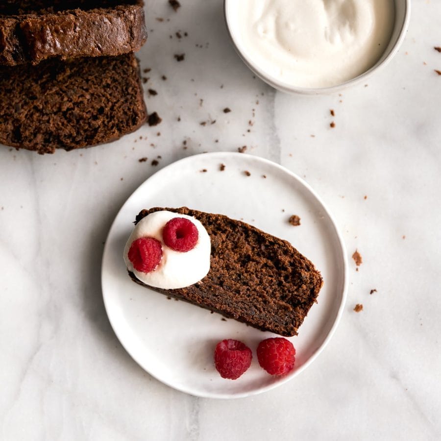 - Serve chocolate banana bread slices with homemade whipped cream and raspberries (optional but delicious). Enjoy!