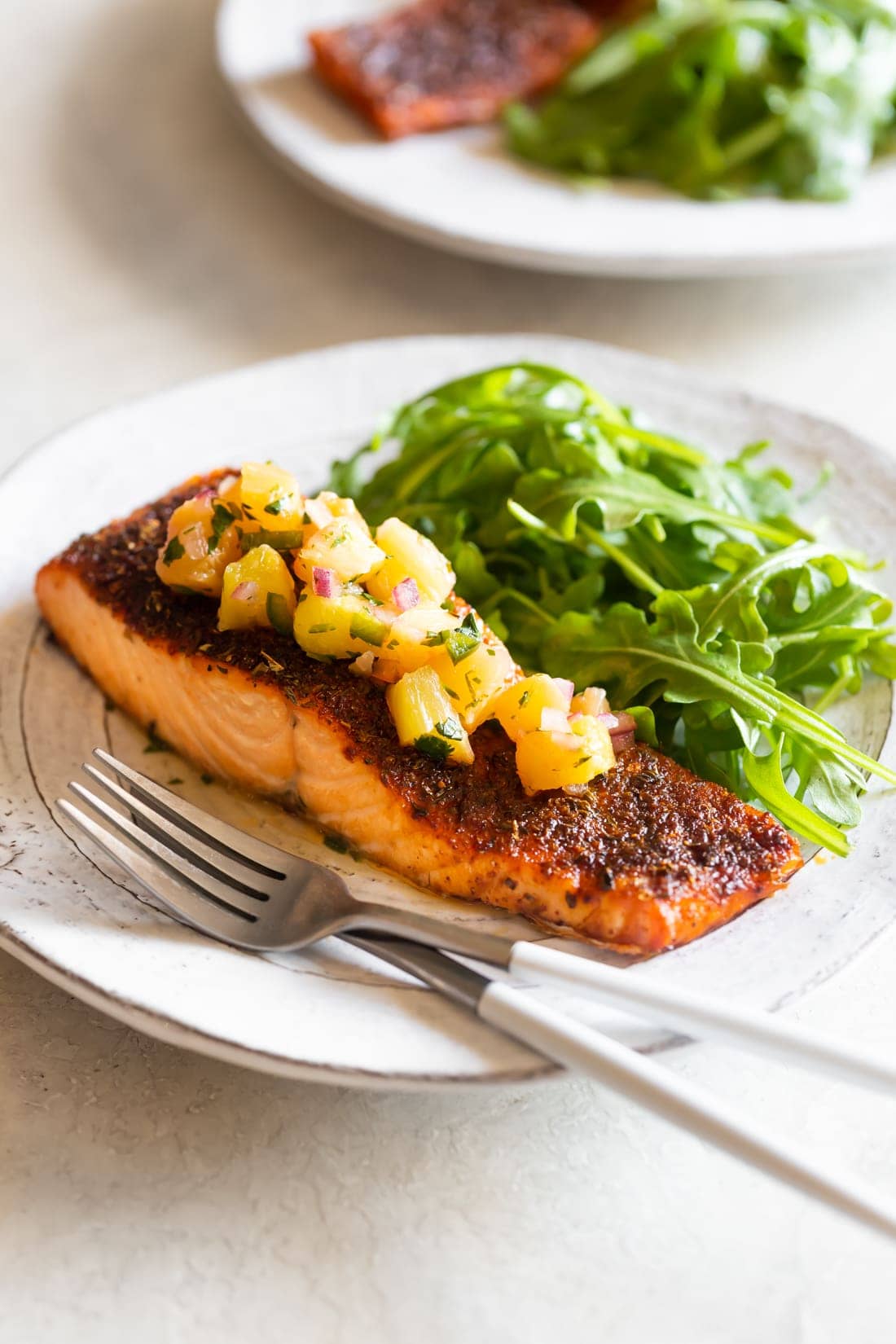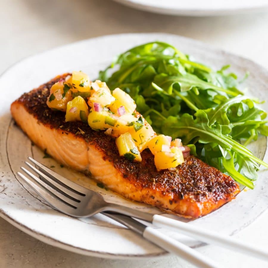 A simple and flavorful blackened salmon recipe made with spicy, smoky seasonings and topped with a pineapple-jalapeño salsa.