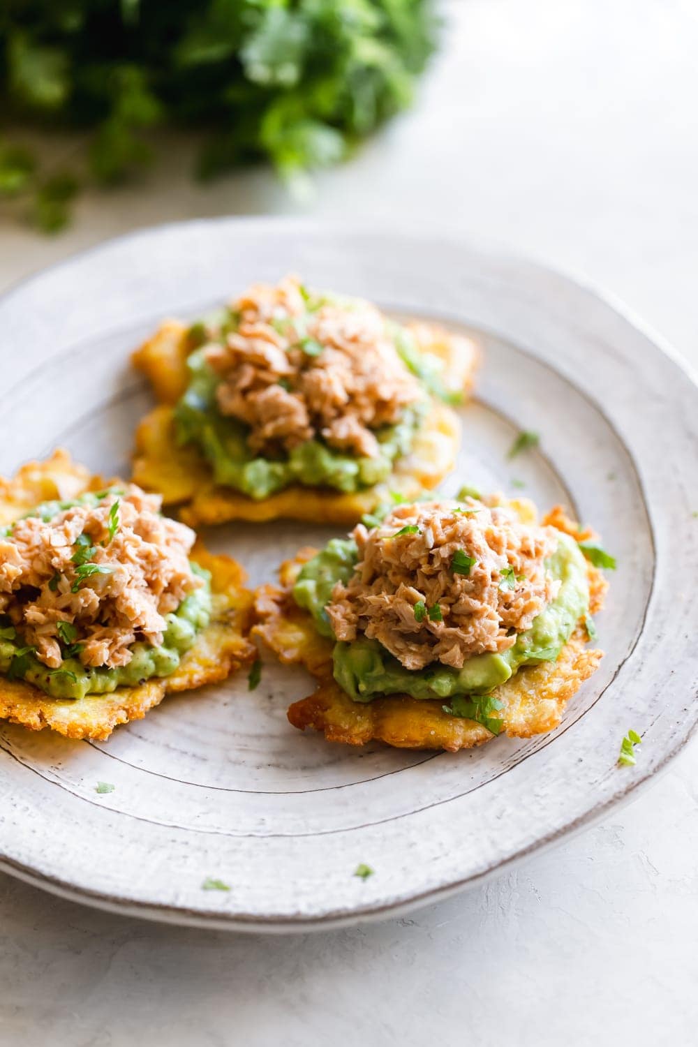 The salmon mixture has some serious heat plus it tastes slightly smoky and tangy too. Pair that with crispy tostones and mashed avocado and well… you have the absolutely perfect lunch or appetizer idea. I promise your friends and family will love it!