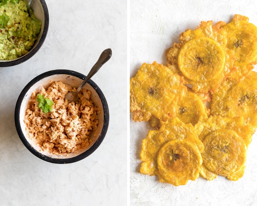 First things first, you’re going to make your tostones! Twice-fried plantains are super easy to make. I have a full tutorial on how to make tostones right here.