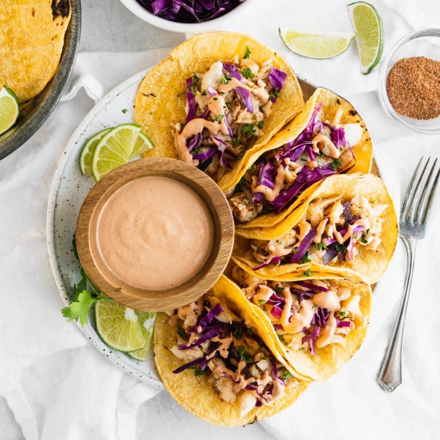 Loved this! My fish of choice was halibut and salmon (yes, salmon works) because that is what we caught and had in the freezer. I went light on the rub because the fish was, well, wild caught. The sauce is awesome!! I didn’t do the slaw but I did use finely shredded cabbage for crunch.