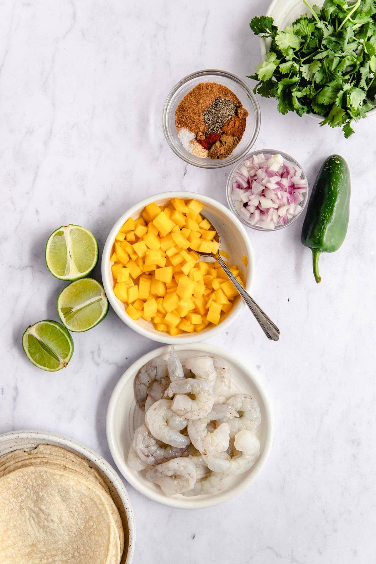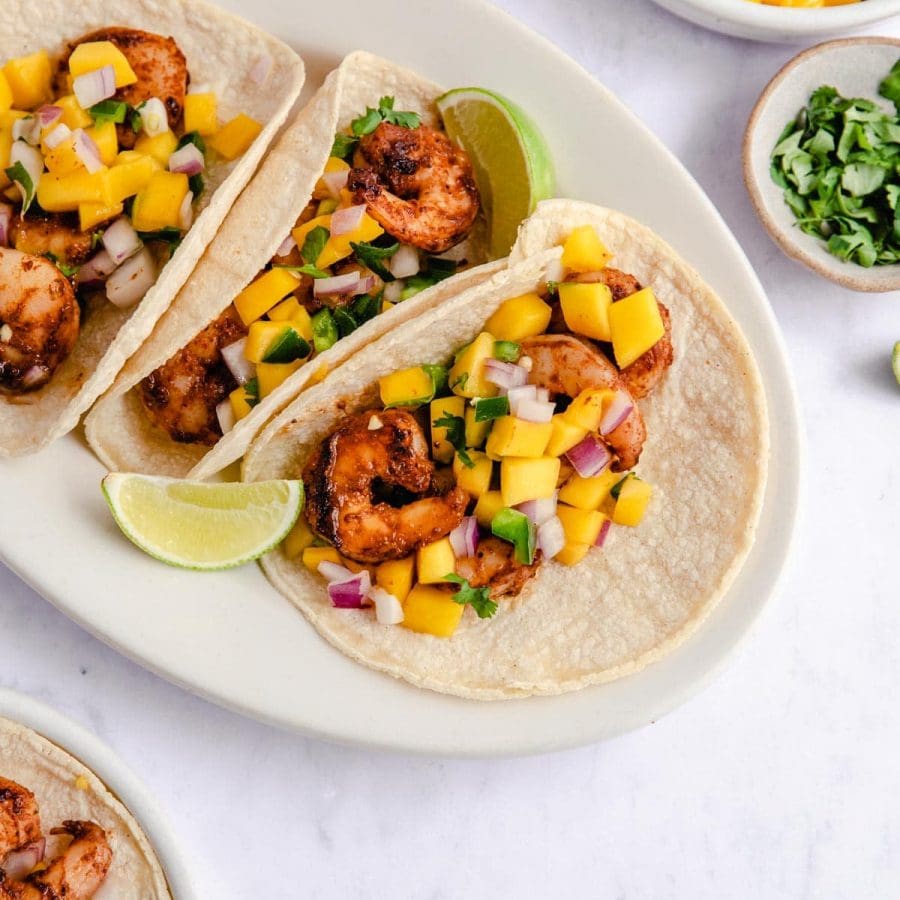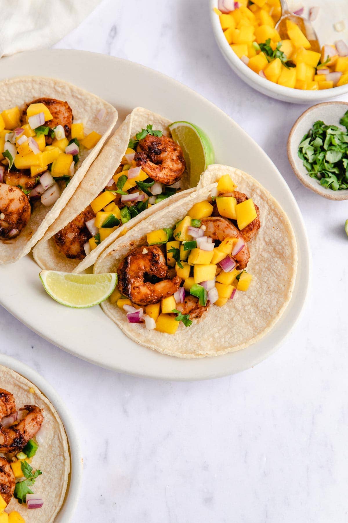- Assemble the tacos. Divide shrimp evenly among the warm tortillas and top with mango salsa. Serve immediately with lime wedges.