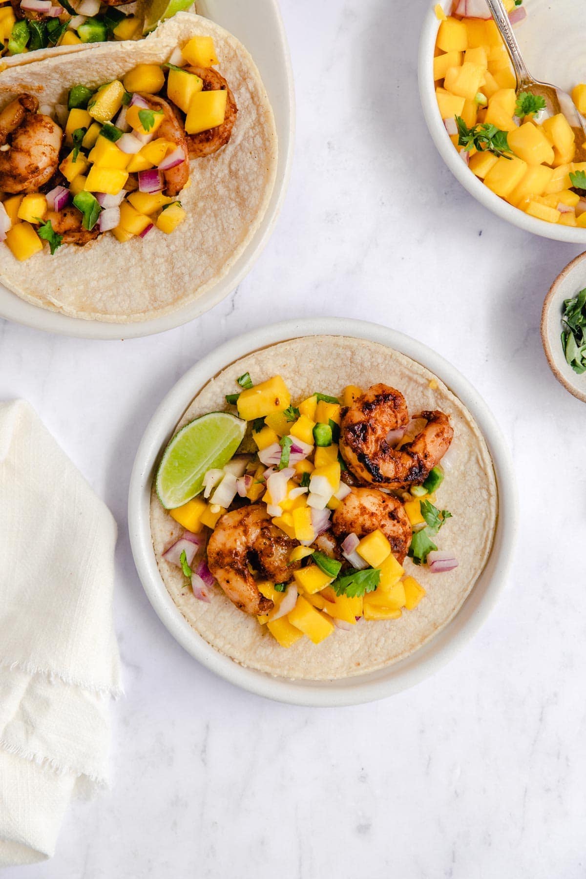 Jerk shrimp tacos! Spicy shrimp tacos made with homemade jerk seasoning then topped with mango salsa. Easy 15-minute recipe for any day of the week!