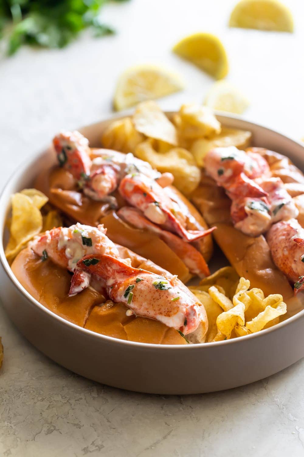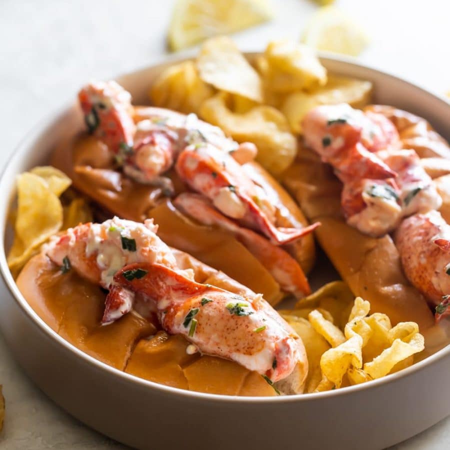 - Divide the lobster mixture evenly into the 4 buns and drizzle remaining butter. Serve with chips and lemon wedges. Enjoy!