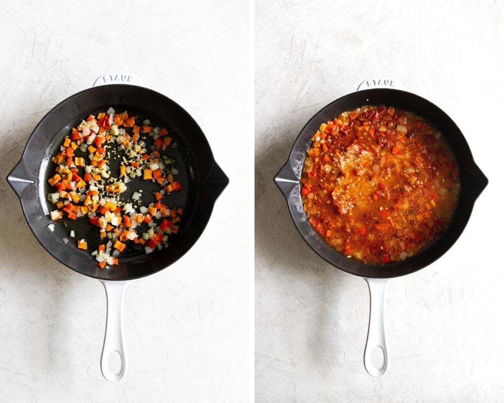 - In a skillet, heat olive oil over medium-high heat. Sauté onion and red bell peppers for 5 minutes. Sauté garlic in the last minute. Careful not to burn it.