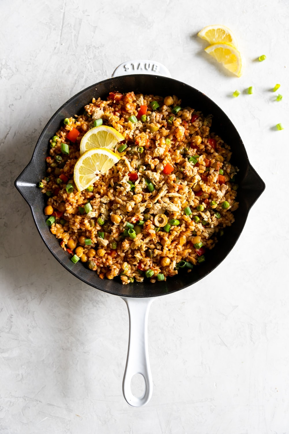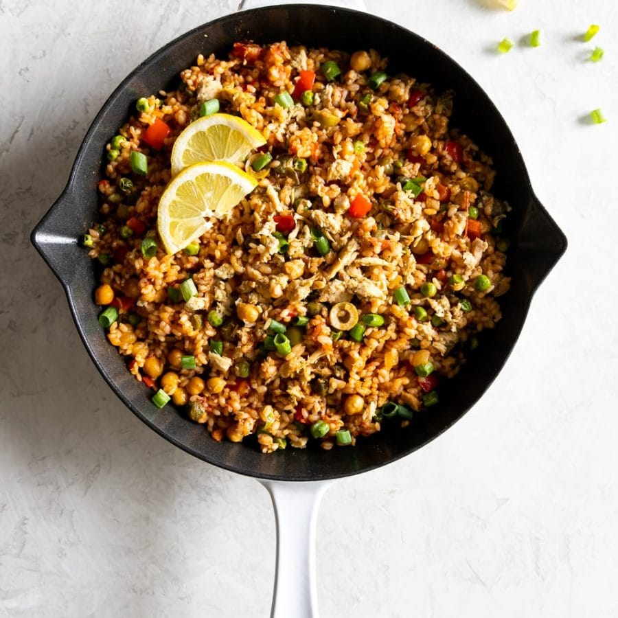 A one-pan flavorful rice dish made with chickpeas, red peppers, diced tomatoes, olive, capers, peas, and lemon dill tuna. Super easy paella recipe!
