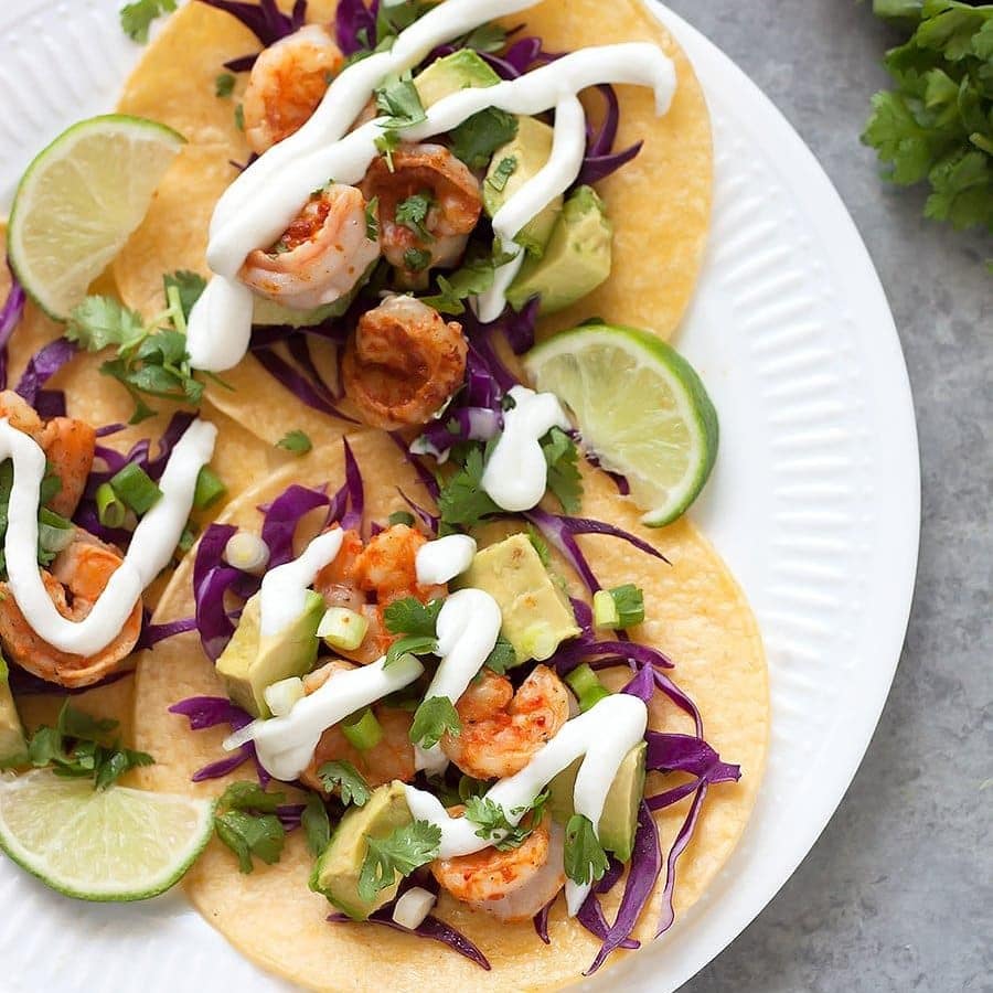 - Divide red cabbage, shrimp, avocado, evenly among the warm tortillas. Drizzle with sour cream and top with scallions. Serve immediately. Enjoy!