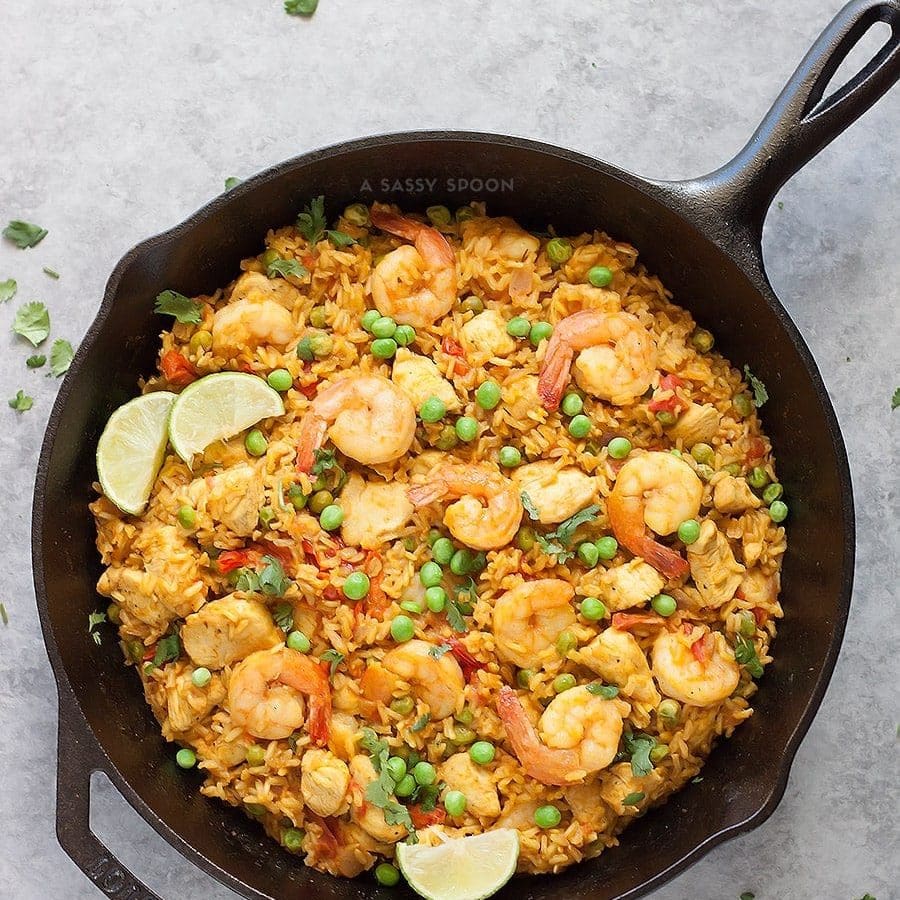 This quick paella recipe is great for special occasions or even a quick weeknight meal! I used my favorite cast-iron skillet which I highly recommend. Btw, the leftovers taste even better! Hello meal prep. ;)