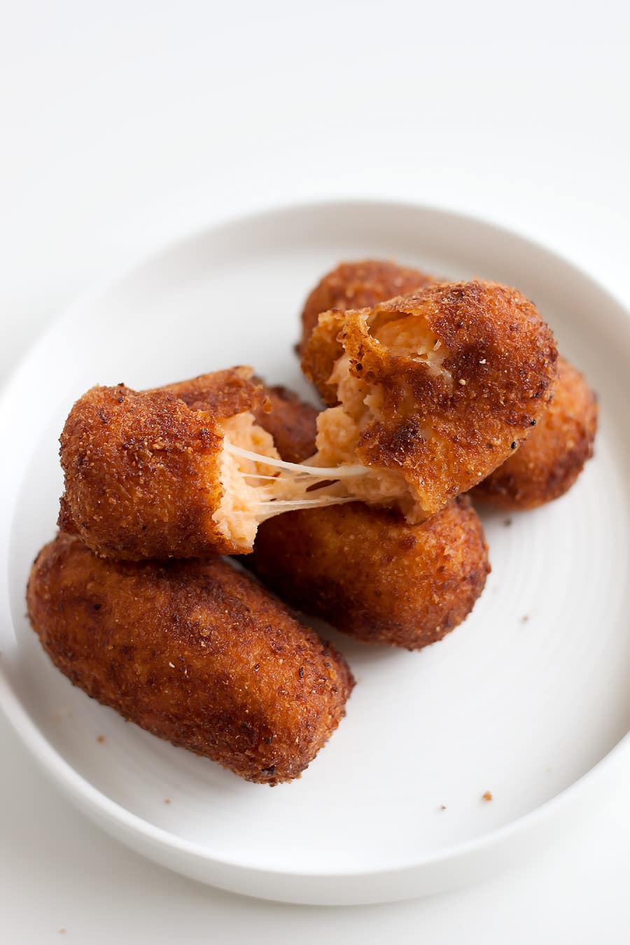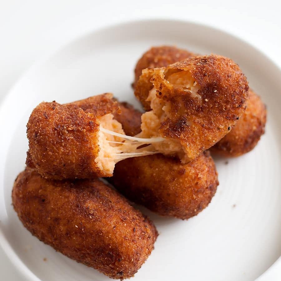 - To make the croquettes, spoon approximately 1 tablespoon of the mixture and form a log 3 inch long and about 3/4 thick. Using the remaining shredded mozzarella, grab a pinch of mozzarella and add it into the middle of the log before you completely form it. This is where the melty cheesy goodness comes into play! Repeat until you have all the croquettes done.