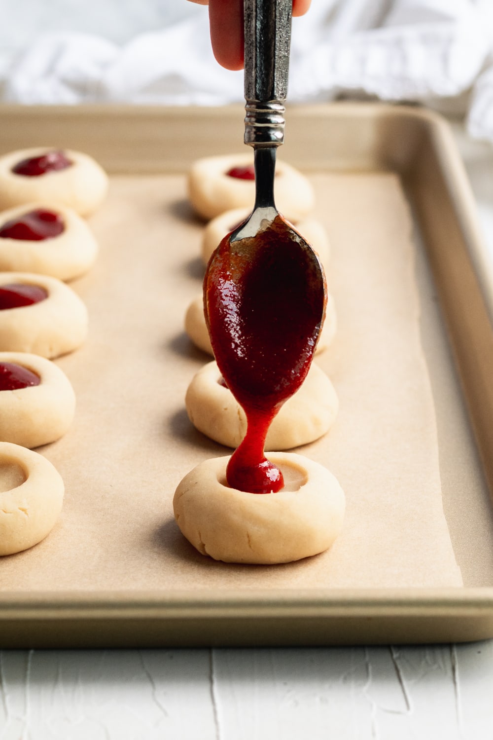 - Remove the baking sheet from the fridge and spoon 1/2 teaspoon of the guava jam into the indentation in each one. Using room temperature jam will make it easier to add the jam into each cookie.