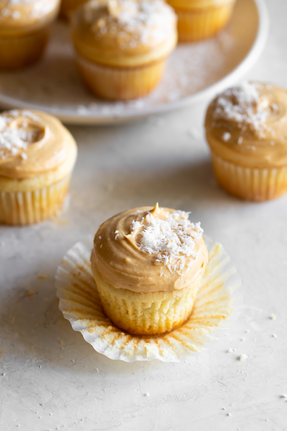 - Pipe the dulce de leche frosting over the cupcakes. Sprinkle with shredded coconut flakes. Enjoy!