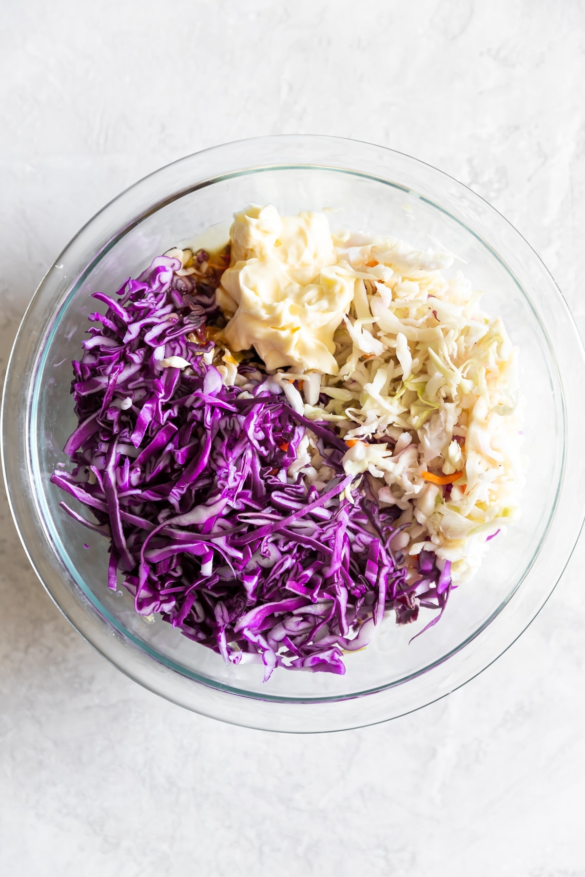- In a bowl, mix coleslaw, red cabbage, mayo, red wine vinegar, honey, salt, and pepper until well combined. Set aside.