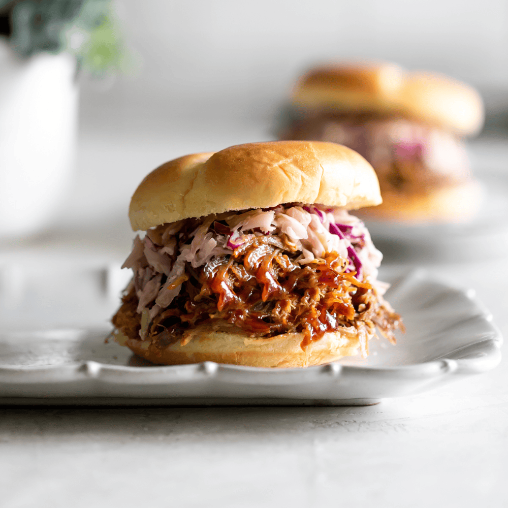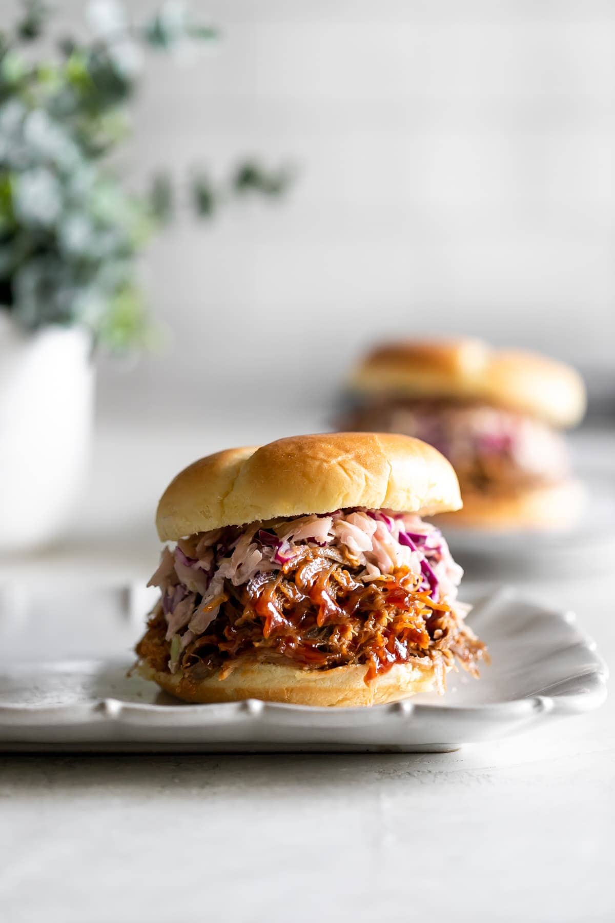- Evenly divide the BBQ pulled pork between the toasted buns then top with the slaw. Serve and enjoy!