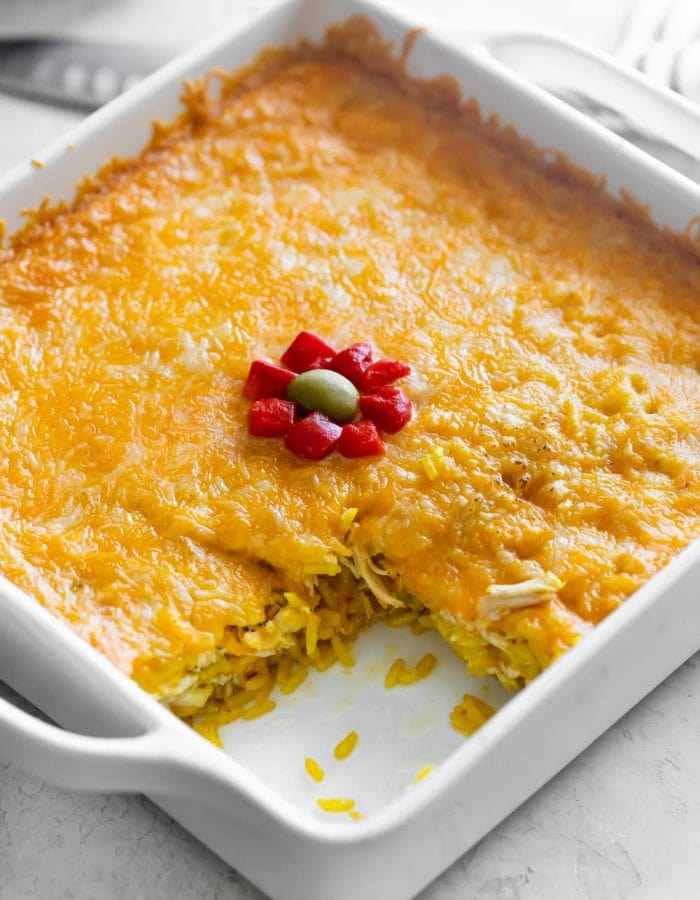 Cuban Arroz Imperial aka Imperial Rice. A classic Cuban comfort food dish made with layers of yellow rice, shredded chicken, mayonnaise, and melted cheese. Perfect for parties, large crowds, and any time of year!