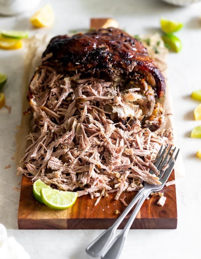 Experience the rich tradition of Cuban Noche Buena (Christmas Eve) with this mouthwatering Cuban Lechon Asado. The pork shoulder is marinated in a homemade garlic-citrus mojo marinade and then slow-roasted to perfection in the oven. The result is tender, juicy shredded pork with that coveted crispy pork skin, making it a delightful tradition reminiscent of holiday gatherings you'll want to savor year-round.
