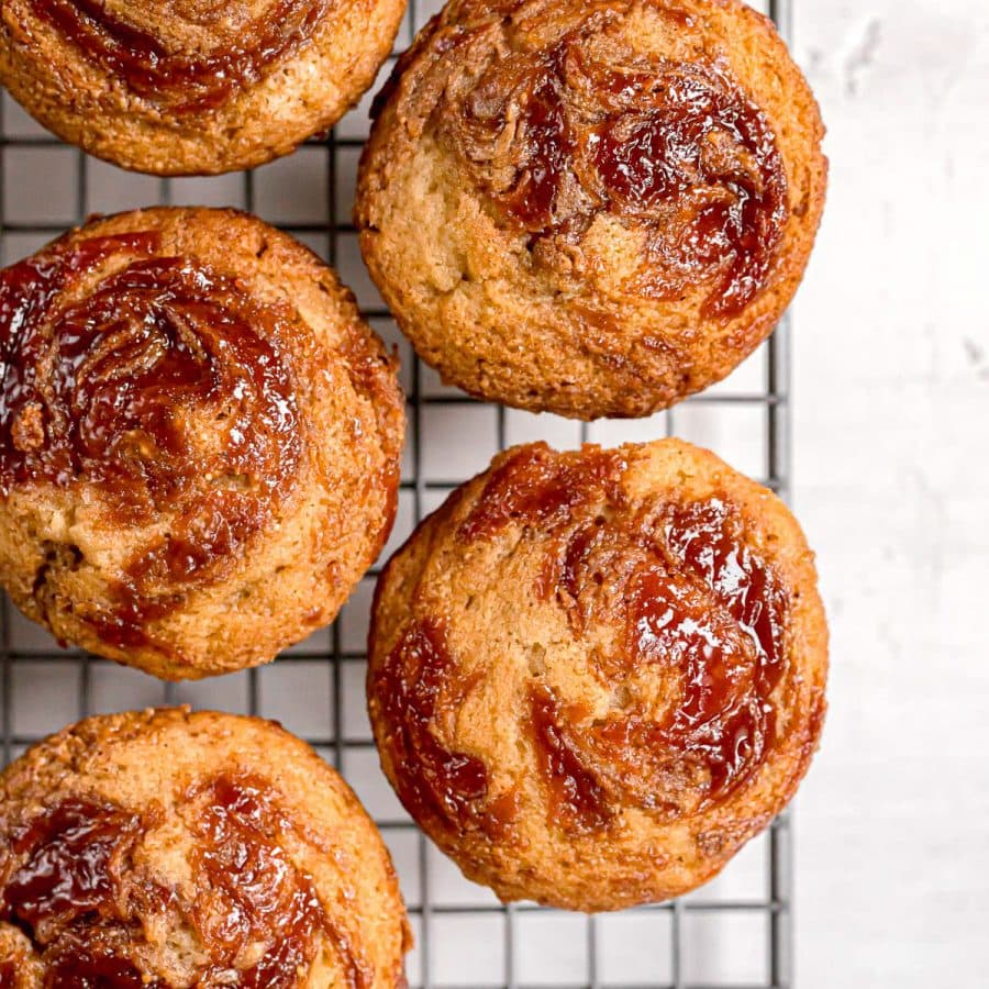 - Preheat the oven to 425ºF. Spray a 12 cup muffin tin with nonstick cooking spray. Divide batter evenly into the prepared muffin tin, filling each muffin cup 3/4 full. Swirl the almond butter and guava jelly on top of each muffin with a toothpick.