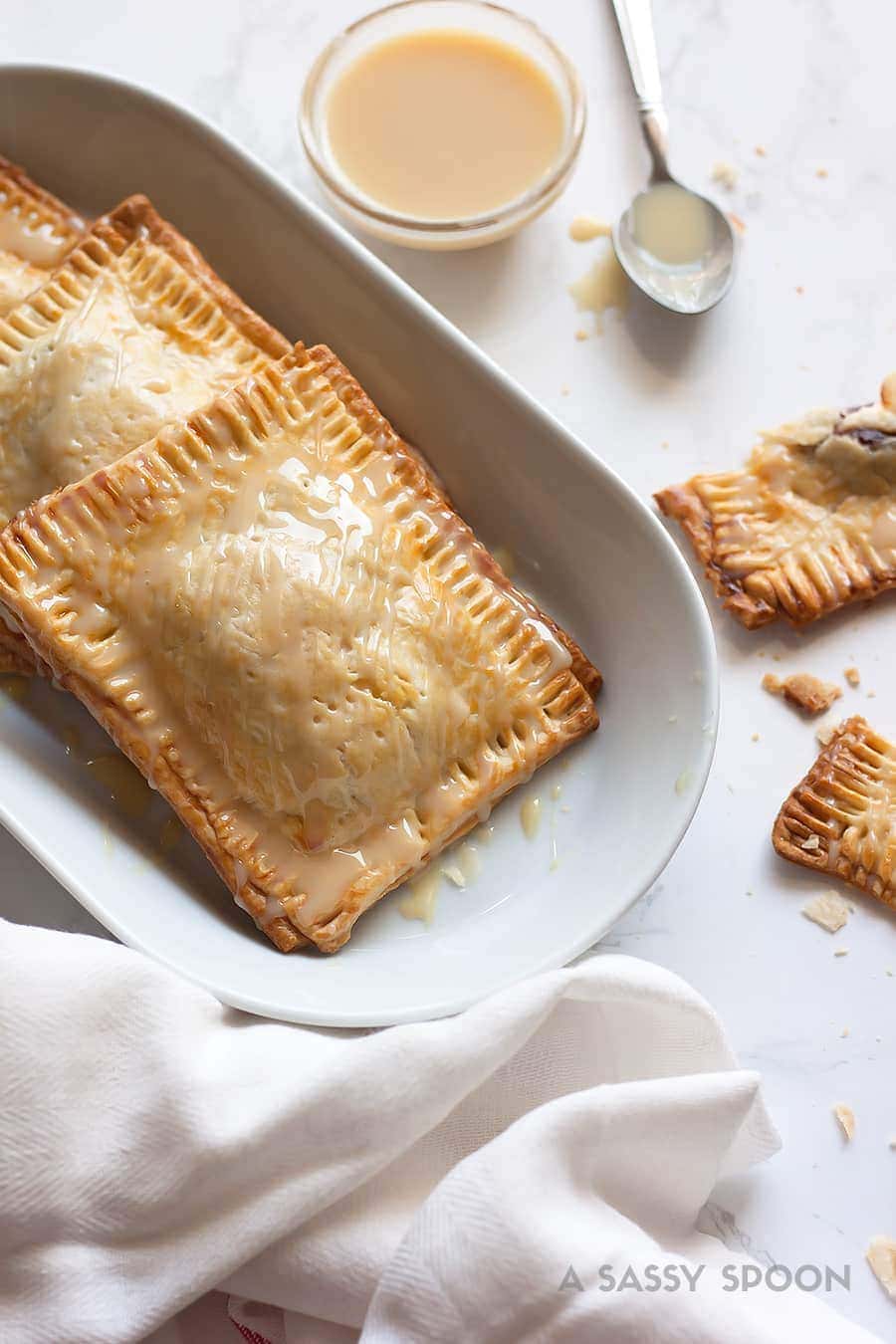 The filling is the real star of the recipe. Plus adding that drizzle of condensed milk? C’mon! How much better can this get! You can also just dip the entire pop tart into the condensed milk or even pour some on top instead of drizzle – you are the master of your own destiny.