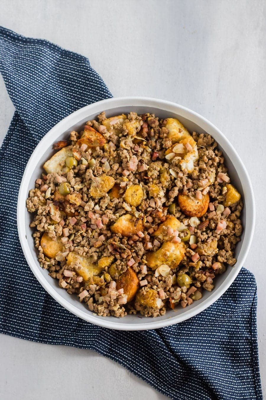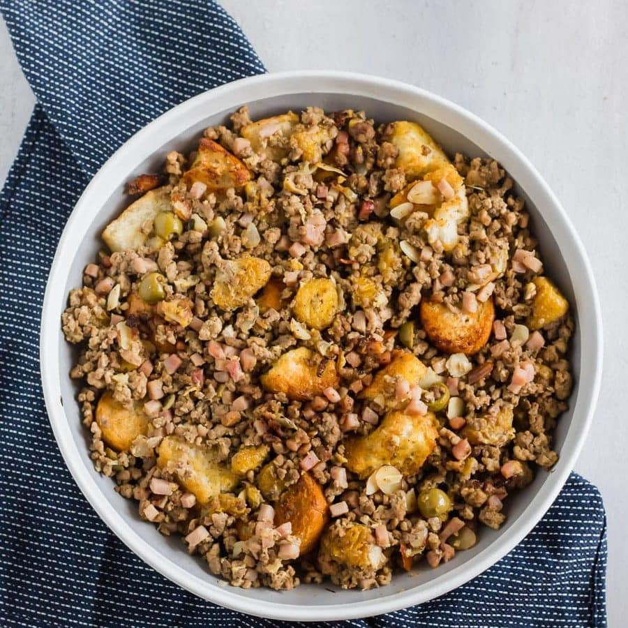 Cubes of toasty French bread mixed with ground beef, ground pork, diced ham, herbs, spices, sliced almonds, chopped olives, and sweet plantains! The BEST stuffing you’ll ever try!