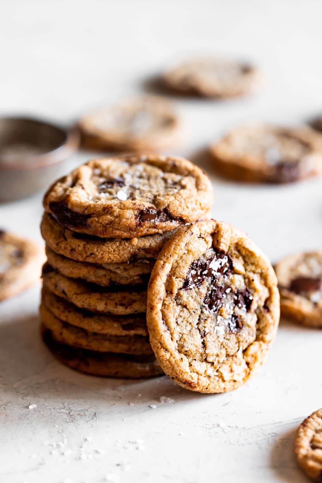 - Bake the cookies! When ready to bake, remove dough from the fridge. Preheat oven to 350ºF. Line a baking sheet with parchment paper and place dough balls on the baking sheet. Bake for 10-11 minutes until the edges are golden brown. Remove from oven and sprinkle with flaky sea salt. It’s ok if they are a little undercooked, they will continue to bake as they cool. Cool for 5 minutes before serving.