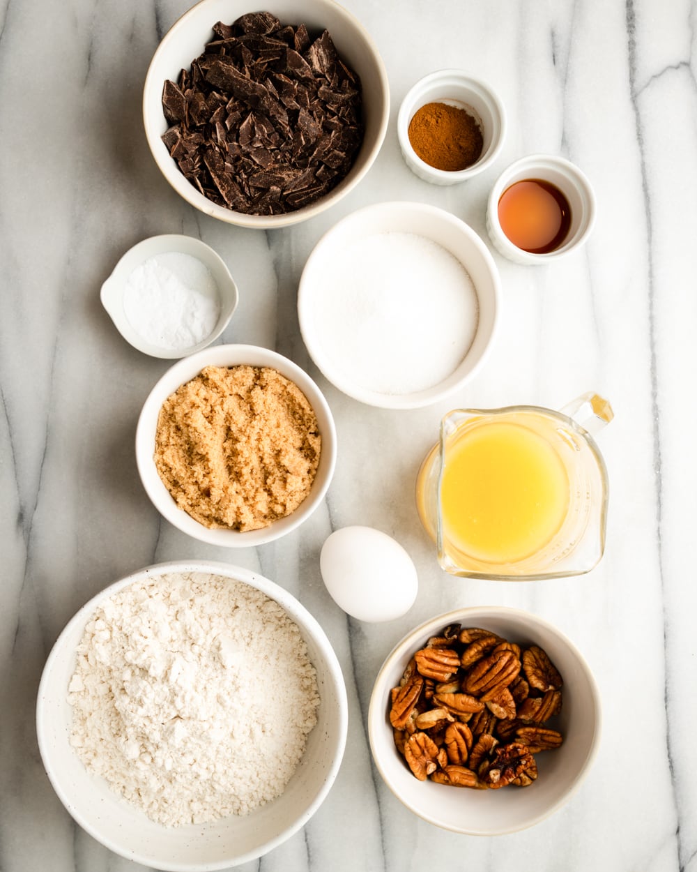 - Add in the dry ingredients. To the same bowl, add flour, baking soda, cinnamon and salt. Mix until just combined. Do NOT over mix. Fold in chopped chocolate and pecans.